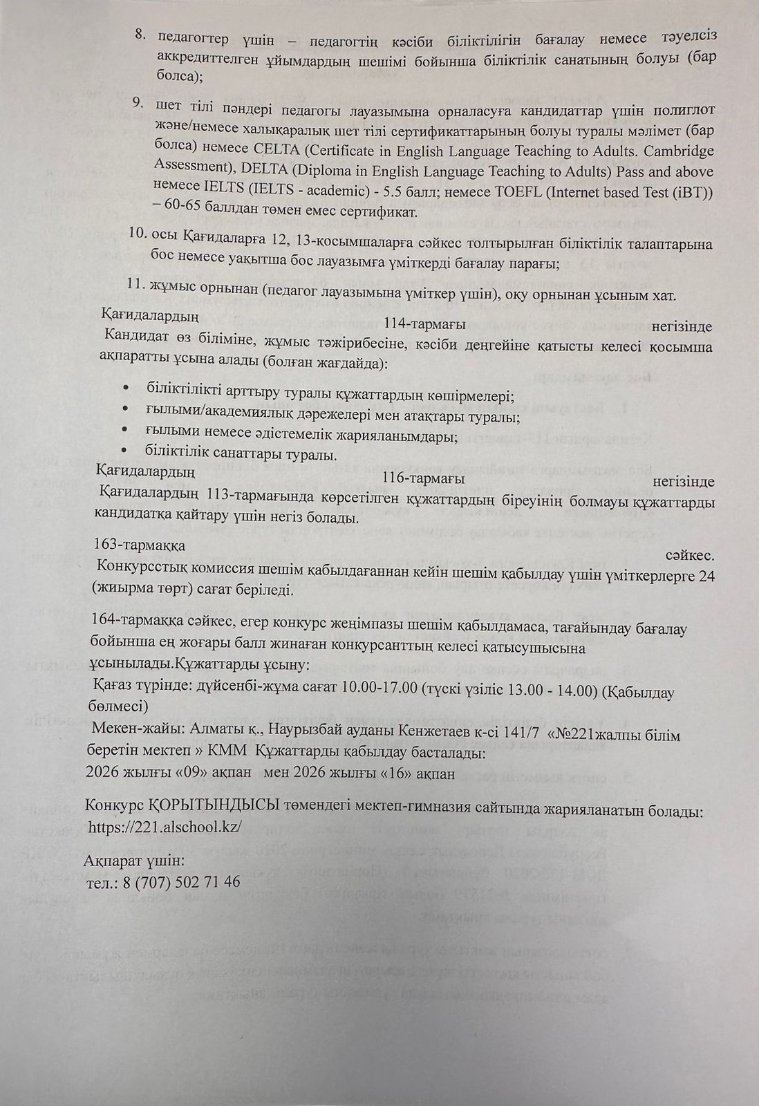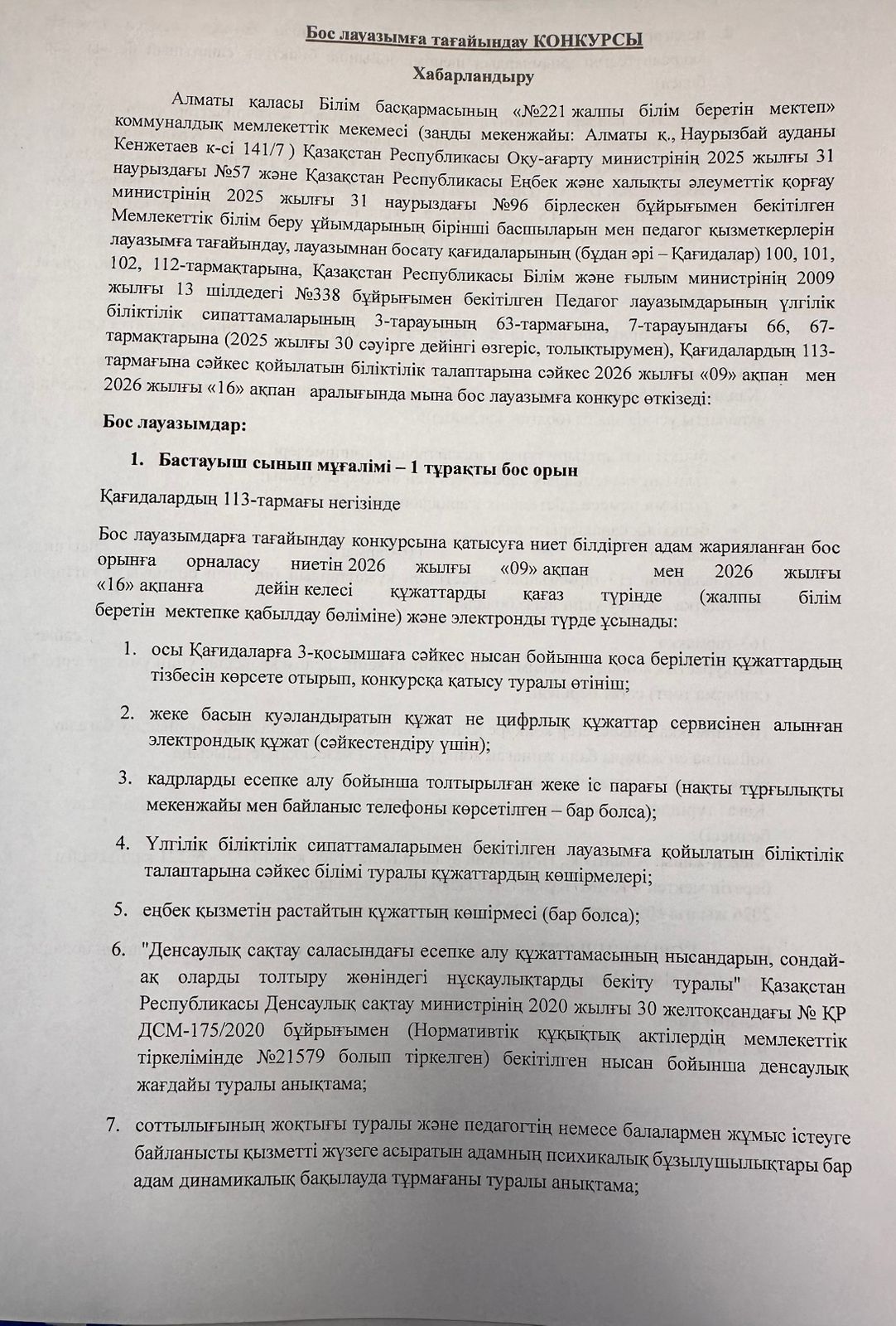 Бос лауазымға тағайындау конкурсы » «№221 жалпы білім беретін мектеп»