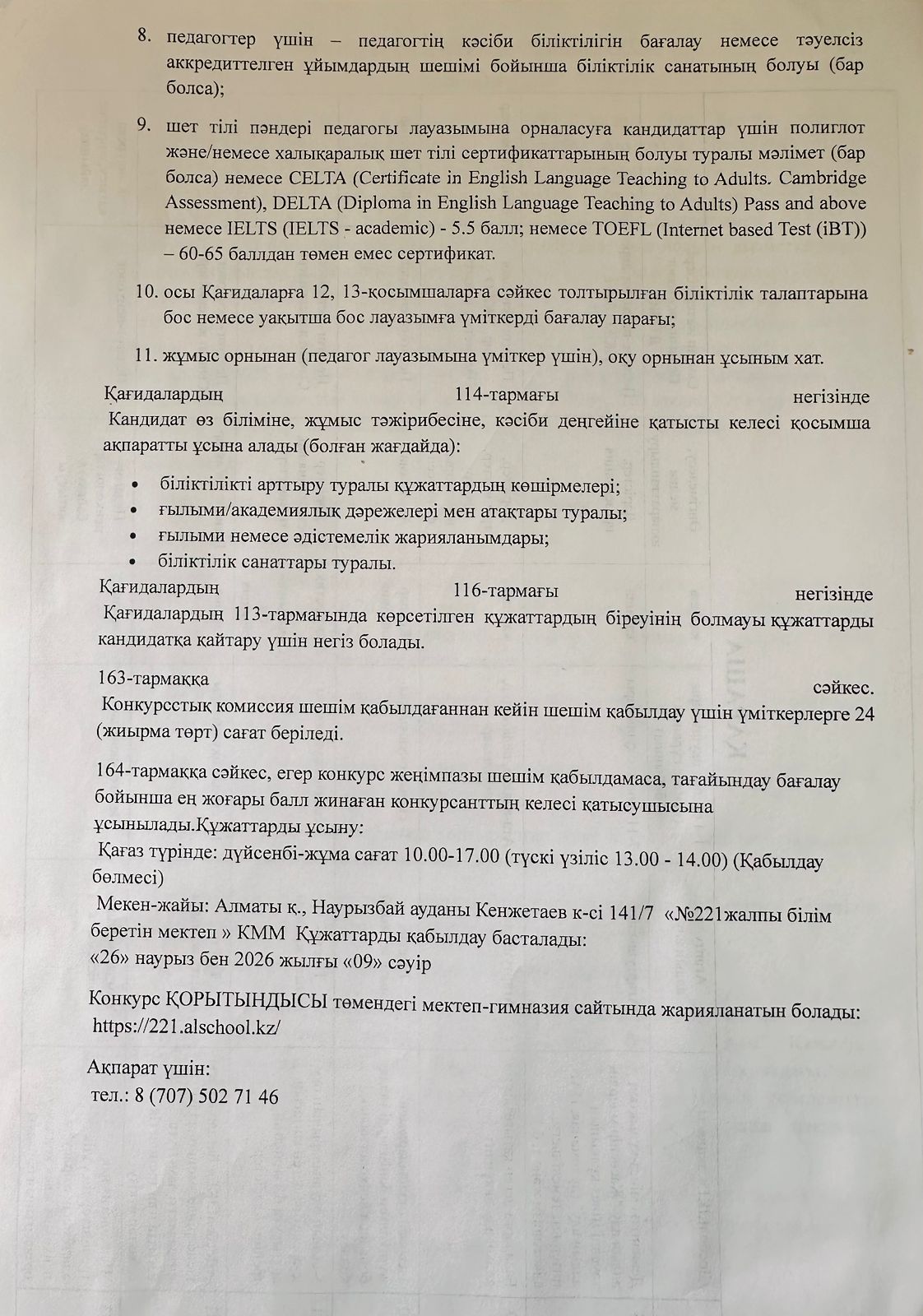 Бос лауазымға тағайындау КОНКУРСЫ » «№221 жалпы білім беретін мектеп»