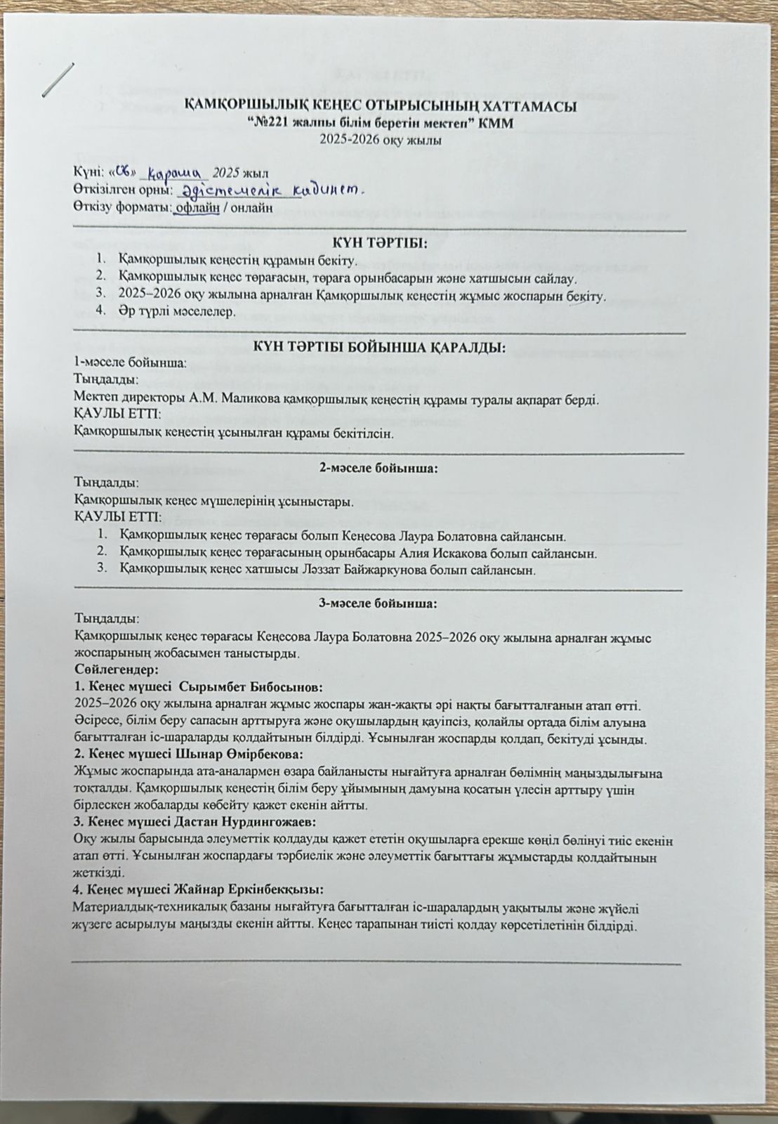 Қамқоршылық кеңес отырысының хаттамасы » «№221 жалпы білім беретін мектеп»
