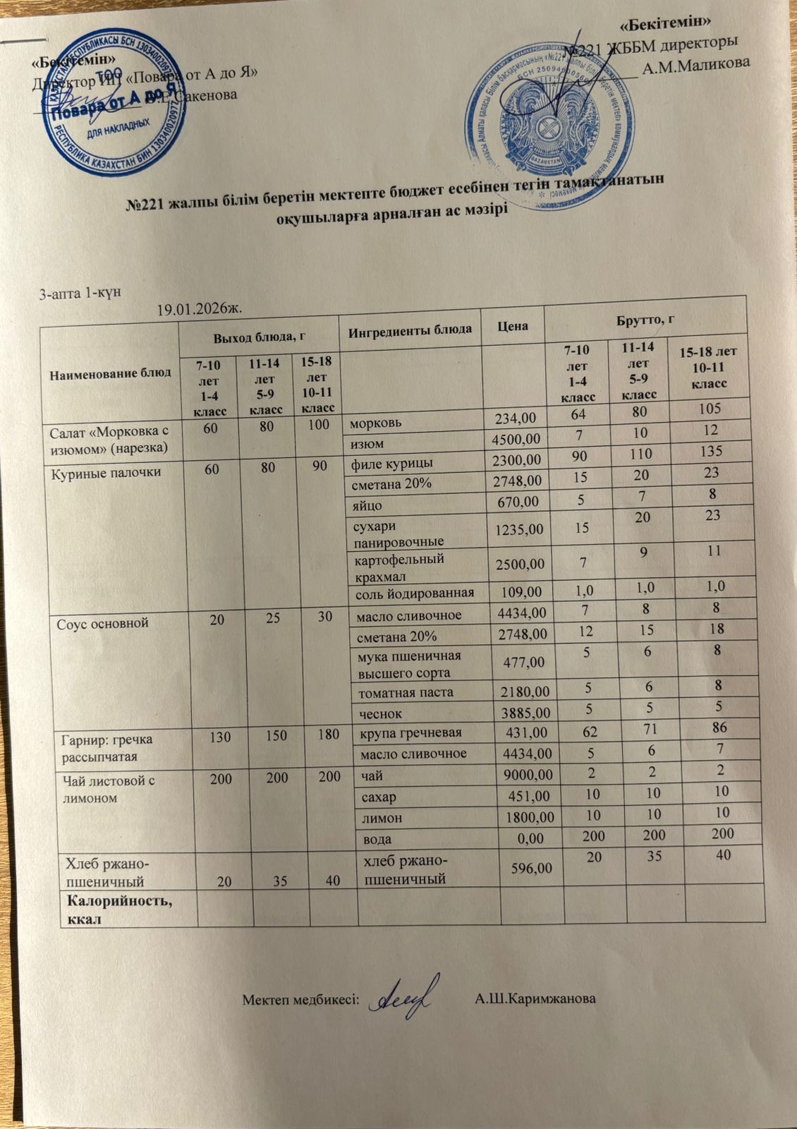 Күнделікті меню 19.01.2026 » «№221 жалпы білім беретін мектеп»