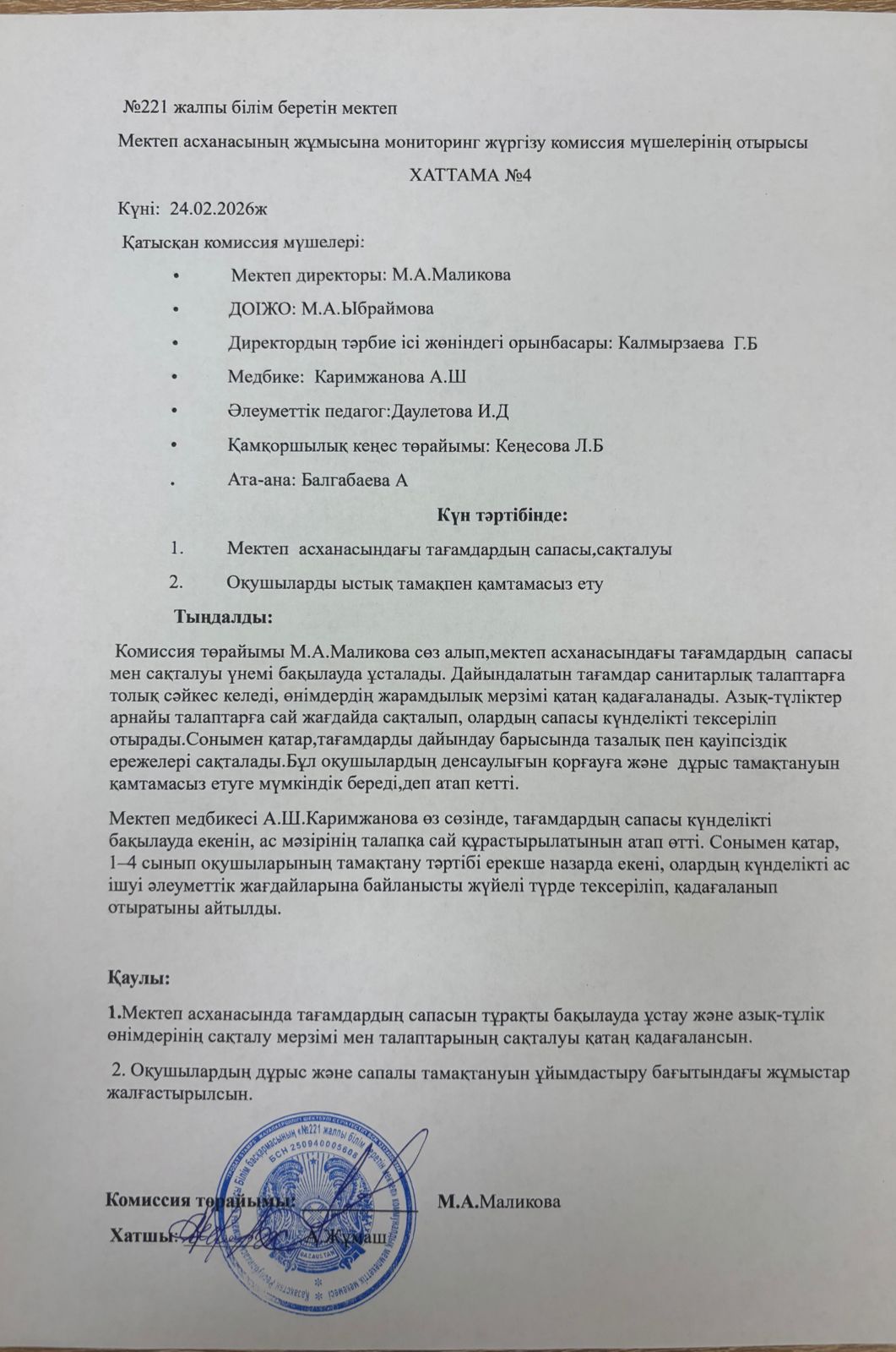 Бракеражды комиссия отырысының №4 хаттамасы » «№221 жалпы білім беретін мектеп»